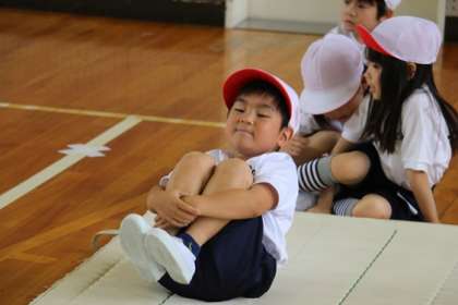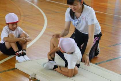 マット運動の基本的な技「前転」につなぎます。