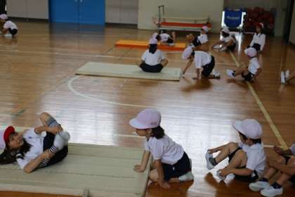 膝を抱えて前後に揺れ、そのまま立ち上がる「ゆりかご」、両足のかかとをつけて1回転する「だるま」。1年生がマット運動で、2つの技を練習しました。