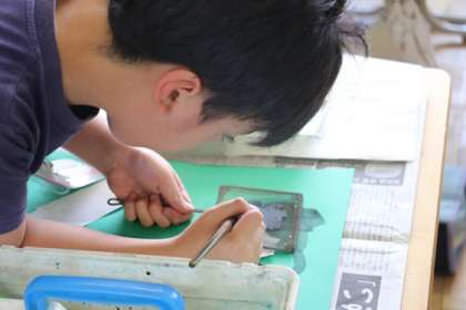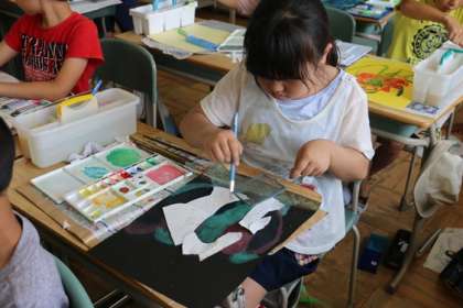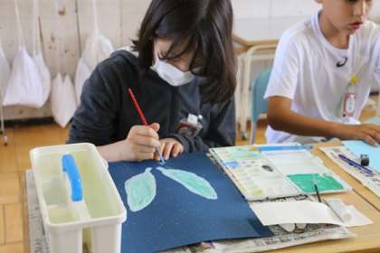 想像の世界に咲く花を描きました。色画用紙を使ったり、歯ブラシの霧ふきの技法を使ったりと、個々に工夫をしました。通常の色や形にこだわらない、不思議な花がたくさん咲きました。