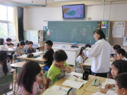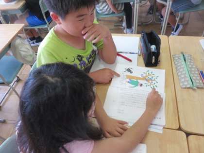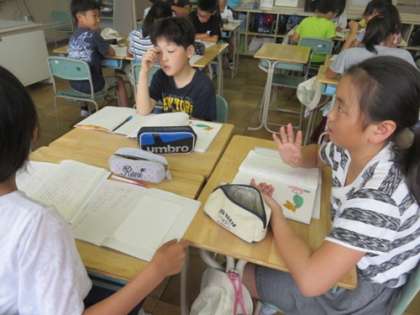 5年生の国語は説明文の学習です。「生き物は円錐形」、変わった題名ですね。先生の指示で、筆者の表現の意図を班ごとに話し合っています。