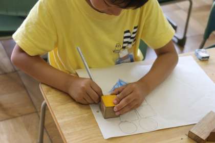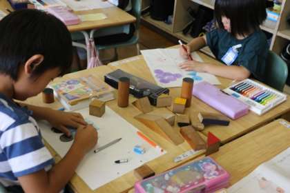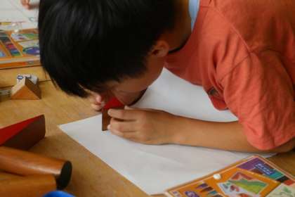 今日はいろいろな立体を紙において。輪郭を写し取りました。同じ立体でもいろいろな形の面があることを感じ取ったでしょうか?(もちろんまだ「立体」「面」などという言葉は学習しませんが)
