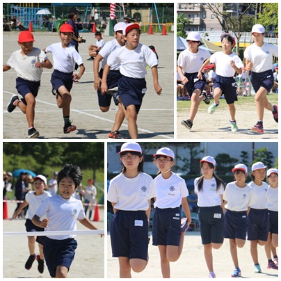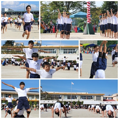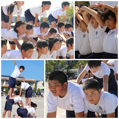 6年生とともに組体操を行った5年生。6年生の示してくれる手本を見ながら、1人技を覚えるところからのスタートでした。最初は2人組の倒立もできない子が多く、苦労の連続です。そんな5年生も、1人1人の努力と上級生と一緒に取り組むことの影響で、技の成功率も日に日に高まって来ました。多くの技を本部側に向かって行った6年生に対して、5年生は児童席側に向かっての演技でした。上級生のたくましさを感じ取った下級生も多かったことでしょう。