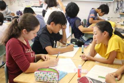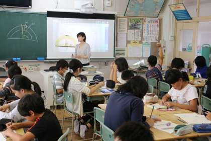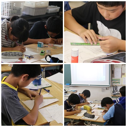 こちらは算数の授業中です。「図形の拡大と縮小」です。うまく拡大図や縮図がかけたでしょうか?「これでどう?」、かいた図を近くの友だちといっしょに確かめます。