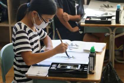 4年生の課題は「秋」。へんとつくりの位置関係や大きさのバランスに注意して書くことがめあてです。その他にも、左はらいや右はらいなど、難しい筆づかいがあります。