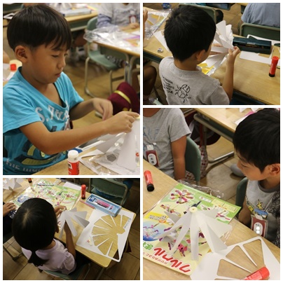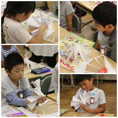 風車を作りました。今日はキットを使って、回る仕組みを作ります。お隣さんと相談したり、間違いないか確かめ合ったりしていました。