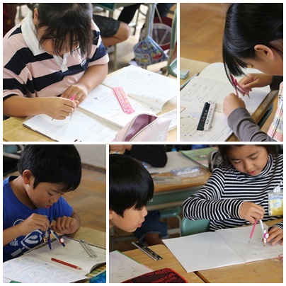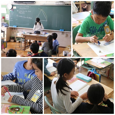 3年生は1組も2組も三角形の勉強をしています。コンパスを使って二等辺三角形や正三角形をかきます。コンパスは3年生から使い始める道具です。かいているうちに、針がずれたり、開きの幅が変わったりして、うまく使うのは決して簡単ではありません。うまく使えるように、苦労している子も多かったような・・・。でも、その苦労もまた大事。