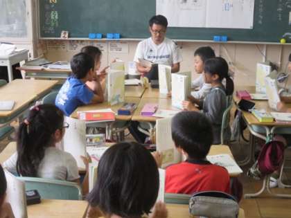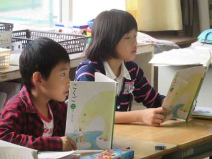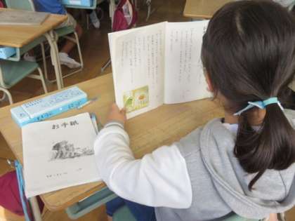 かえるくんとがまくんが登場するほのぼのとしたお話、「お手紙」の勉強です。先生が地の文を読み、2人組でかえるくんとがまくんに分かれて読みました。かえるくんやがまくんになりきって、表情豊かに読むしのっ子があちらこちらに見られました。