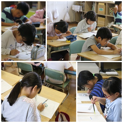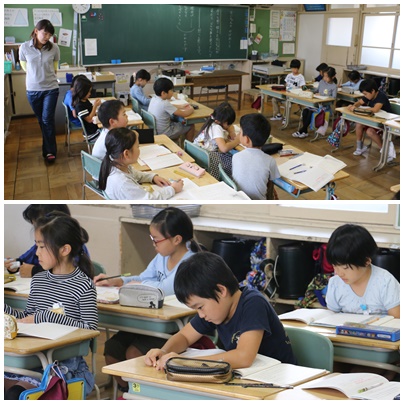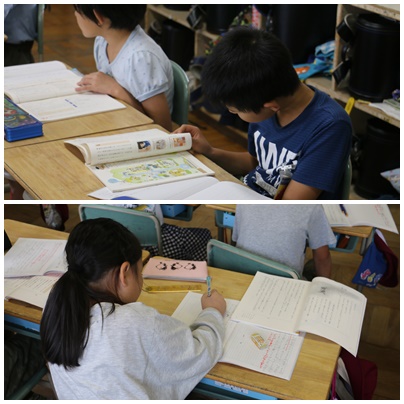 3年生の2クラスは同じ時間に国語をしていました。ともに「ちいちゃんのかげおくり」の勉強です。戦争中を舞台にした重みのある話です。ちいちゃんの思いにせまるため、本文をじっくりと読み込みます。
