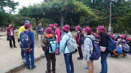 東大寺で再集合。ボランティアガイドさんとお別れして京都へ向かいます。先生の後ろの鹿に、気を取られている人はいませんか?
