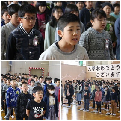 担任の先生発表の後は、1年生との対面式です。上級生と向かい合い、代表の合図で「よろしくおねがいします。」と声を掛け合いました。