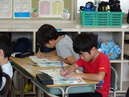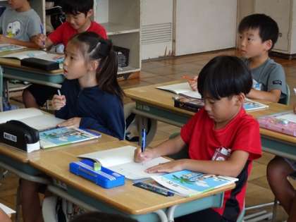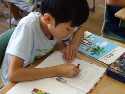 2年生も算数の授業中。たし算の筆算です。2度くり上がりがあったり、3階建ての筆算など、だんだん難しくなっています。しっかりとやり方をつかんだ後は計算練習です。