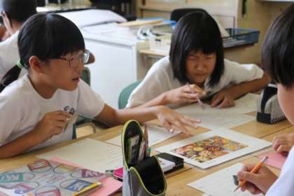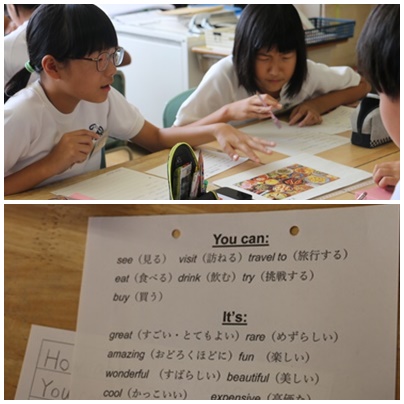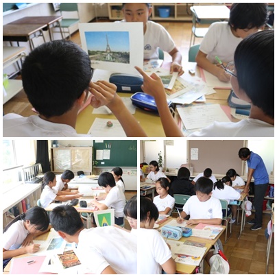 エッフェル塔、ピラミッド・・・など、旅行会社の人になったつもりで、世界の名所や国を紹介します。ここに行くと、○○が見られるよ、○○ができるよ、○○が食べられるよ、などを英語で表現します。今はALTや協力員さんの力を借りて、紹介の文をまとめているところです。