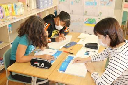 アミーゴ教室ではアミーゴたちが国の勉強中。やっていることをのぞいてみると、今教室で勉強しているのと同じ物語のようです。ただ、他の子のように人物の気持ちや情景をよみ味わうのは難しいので、音読や意味をたどることが中心になります。このように少人数で指導を受けることは、外国籍のしのっ子にとって大きな助けとなります。