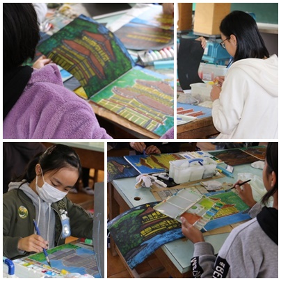 多色刷り版画はいよいよ最終段階です。バレンでこすった台紙をそっとめくり上げると、金閣寺や清水寺が色鮮やかに刷り上がっていました。