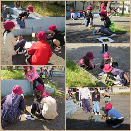 3年生の理科。鏡を複数使って、はね返した日光が当たった所の温度について調べました。温度計が40度近くまで上がる様子に、日光のあたたかさを実感していました。