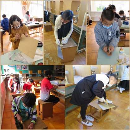4年生の図工。のこぎりでいろいろな形を切った木を組み合わせて,生活で使えるものをつくります。初めて使う「のこぎり」に苦戦していました。