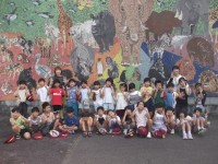 1年生の図工。ハンガーにいろいろな材料をつけて、風に揺れる飾りを作ります。途中、揺れ具合を確認しながら作っていました。