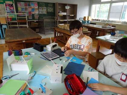みんな真剣です。タブレットで作りたい形の絵をさがし、参考にして作成する人