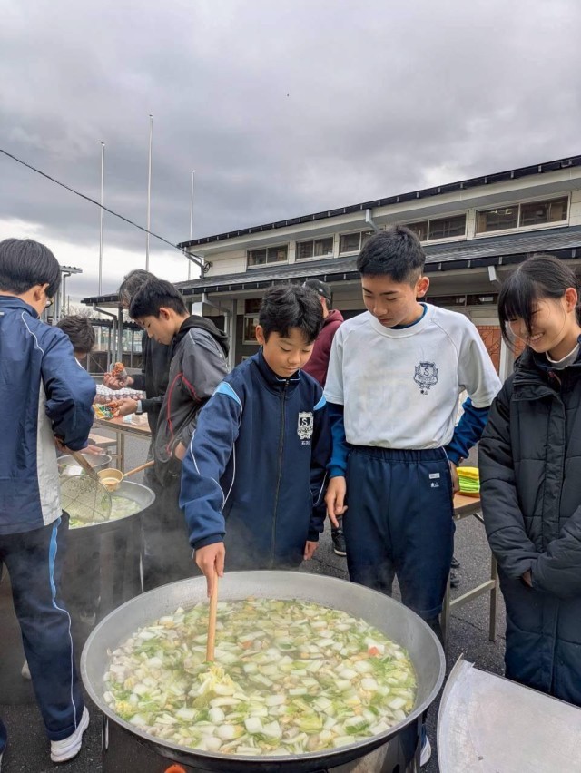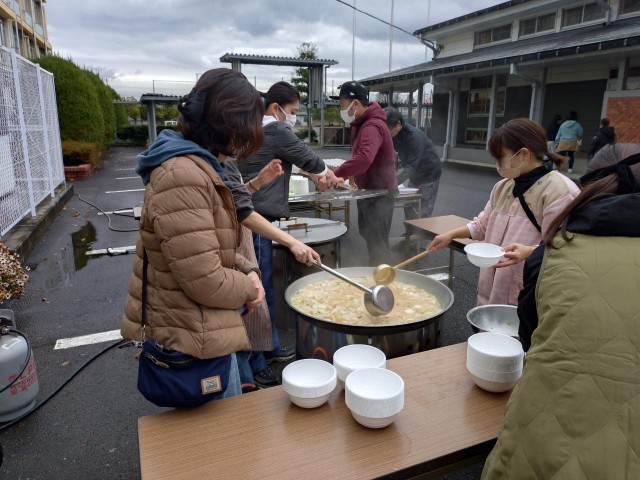 集まったPTAの方や生徒のみなさんで、大きな鍋にたくさんの具を入れて豚汁を作りました。