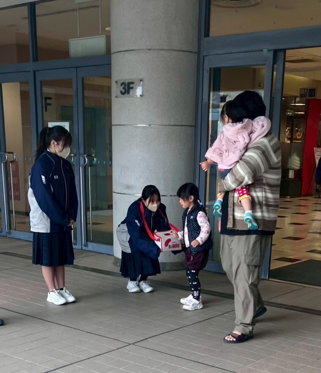 「ありがとうございます」と感謝を伝える団員の姿や、小さな子には優しくかがんで受け取る姿が印象的でした。