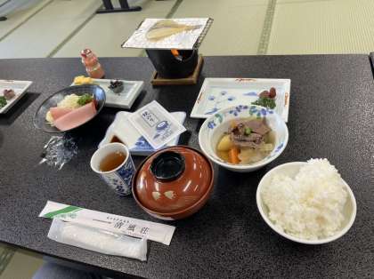 保健美化係から昨晩の夕飯の様子を振り返って、「今日の班別体験のことを見据えて食べすぎないように。」と言葉を受けて、いただきます。