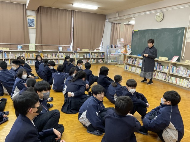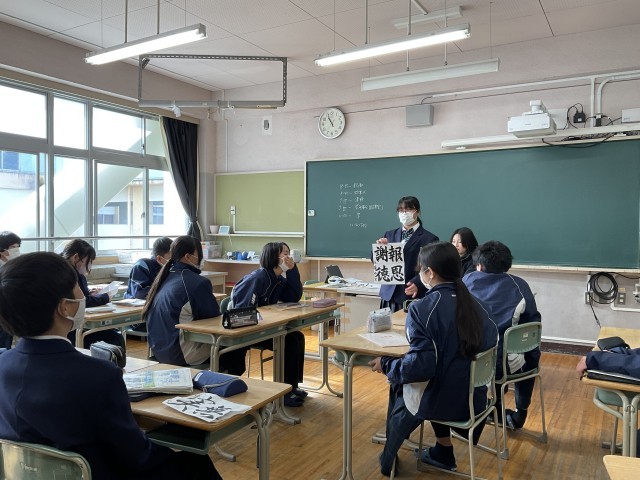 上方講談師の旭堂南海先生をお招きし、社会科とのコラボレーション授業を行いました。序盤は、「上方講談とは何か?」について、お話ししていただきました。また、一休さんや豊臣秀吉の逸話を題材に披露していただいた講談を生徒は興味深く聞いていました。後半は南海先生との対決です。先生のお話の中に散りばめられた嘘を教科書や資料集を使って、みんなで見つけました。どちらのクラスも見事勝利!上方講談に親しむことができる充実した時間になりました。南海先生、ありがとうございました。