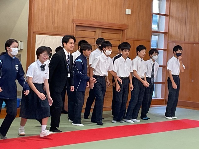 朝、生徒指導集会と聞いて武道場へクラスでともに移動する実習生の先生。