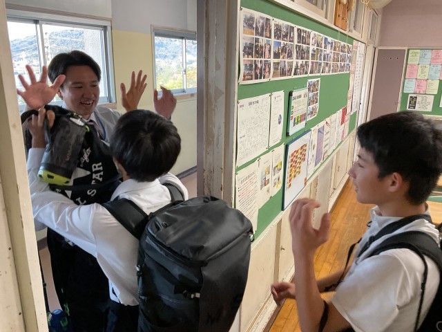 最後のクラス写真とあいさつの後の、先生とのハイタッチはお互いの未来への健闘を称える、素敵な瞬間でした。