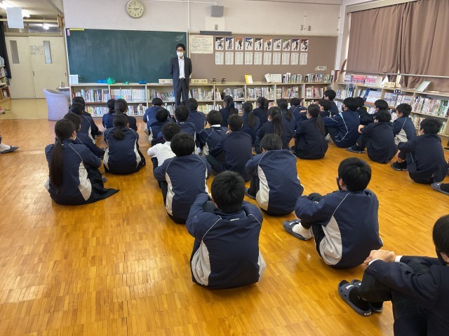 上方講談師の旭堂南海先生をお招きし、社会科とのコラボレーション授業を行いました。最初は上方講談とは何かと、平家物語の那須与一の話を交えて教えてもらいました。その後、南海先生と対決(間違い探し)を行い、教科書や資料集、タブレットを使い講談の間違いを探しました。A組は引き分け(負け?)、B組は勝つことができました。楽しんで学べたかなと思います。南海先生ありがとうございました。 -