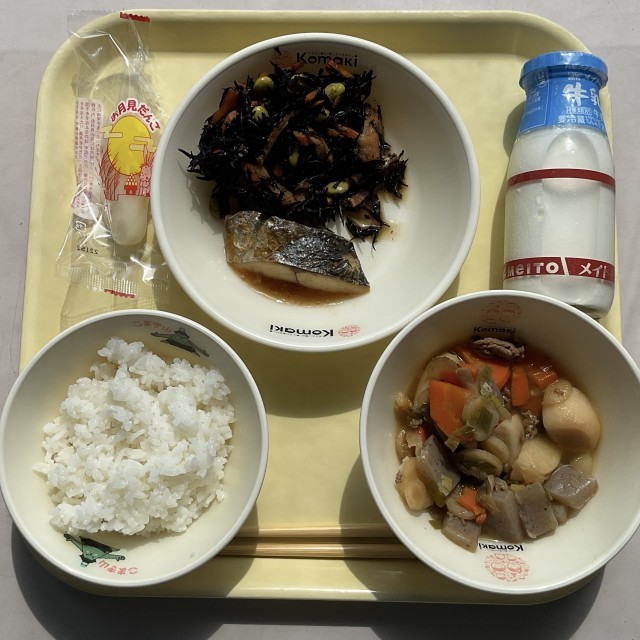 ごはん 牛乳 いも煮 寒さわらのごまだれかけ ひじきの炒め煮 月見団子