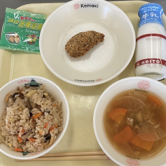 秋の炊き込みご飯 じゃがいもだんご汁 タラの香味フライ 味付き乾燥大豆