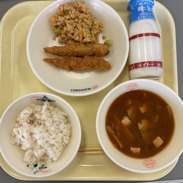 金芽ロウカット玄米ごはん 牛乳 さつまいも入りみそ汁 ししゃもフライのレモンソースかけ カレーおから