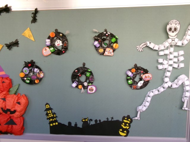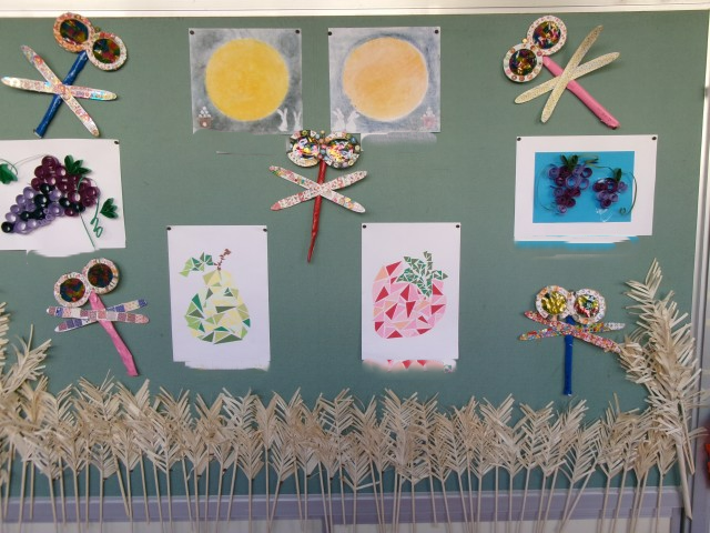 支援学級の子どもたちが壁を一面秋模様に変身させました。紙皿を利用してハロウィンリースを作ったり、切った紙を貼りあわせて果物を作ったり、秋満載です!!11月の学校公開がありますので、ぜひご覧になってください。