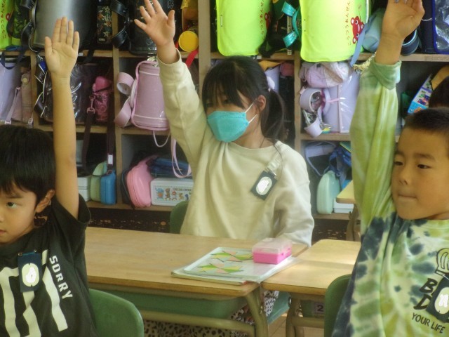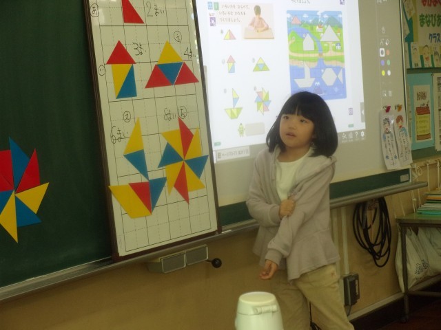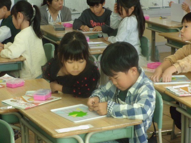 ペアで相談しながら、色板や棒を使って、図形を変化させました。