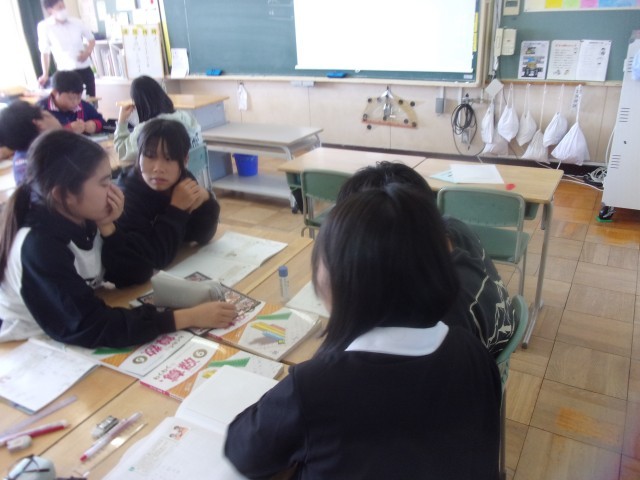 比を使って数量を求める問題に対し、グループで話し合いながら、いろいろな求め方を考えました。
