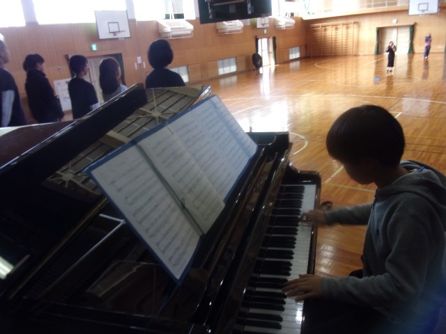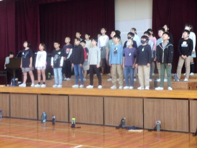 11月6日(木)に行われる小牧市小中学校音楽会に出場する5年生が、体育館で合唱練習をしました。