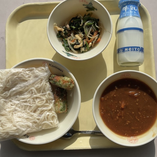 ソフトめん 牛乳 肉みそかけ ちくわのいそべ揚げ 千草あえ