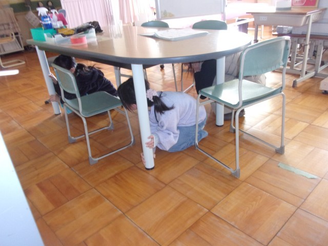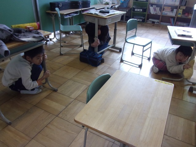1時間目の放課に、予告なしのシェイクアウト訓練(簡易避難訓練)をしました。どの学年も落ち着いて素早く身を守る行動をすることができました。