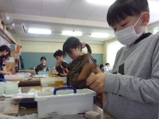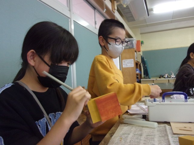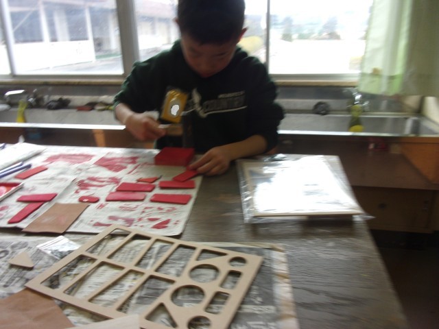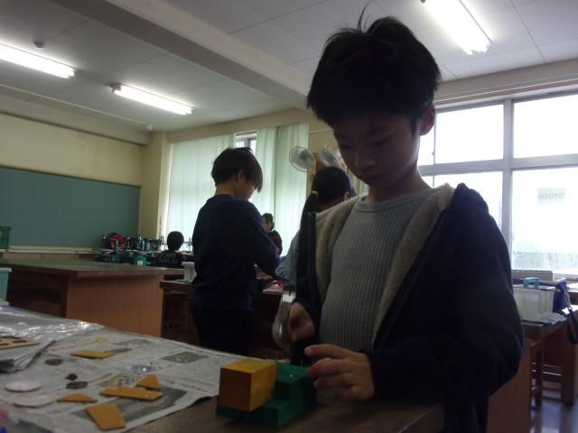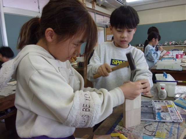 金槌を使って木に釘を打ち、生き物など思いついたものを作りました。