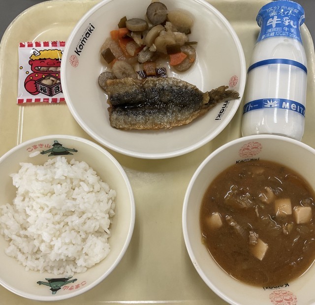 ごはん 牛乳 具だくさんみそ汁 いわしのかば焼き おとしこしの煮物 節分豆 (節分献立)