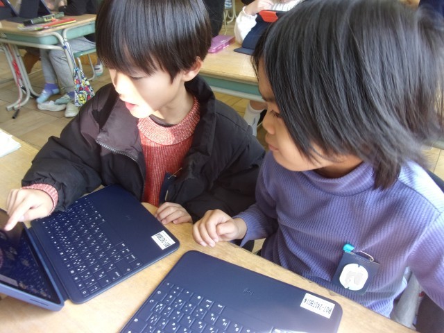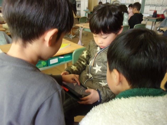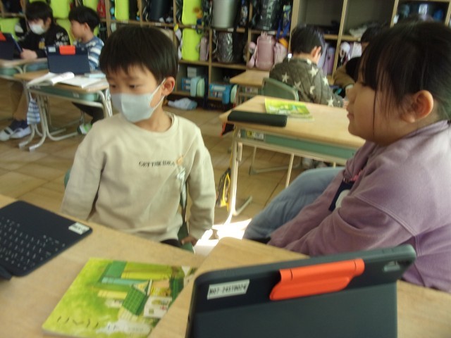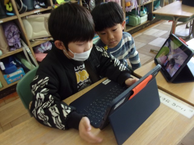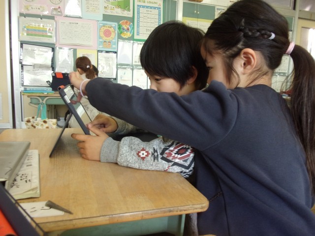 タブレットで撮った写真が何かをあてるクイズ大会に向け、ペアの子に確かめながら準備を進めました。