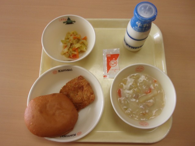 サンドイッチバンズパン 牛乳 豆乳入り白菜のシチュー 白身魚フライ 野菜ソテー マヨネーズ風調味料
