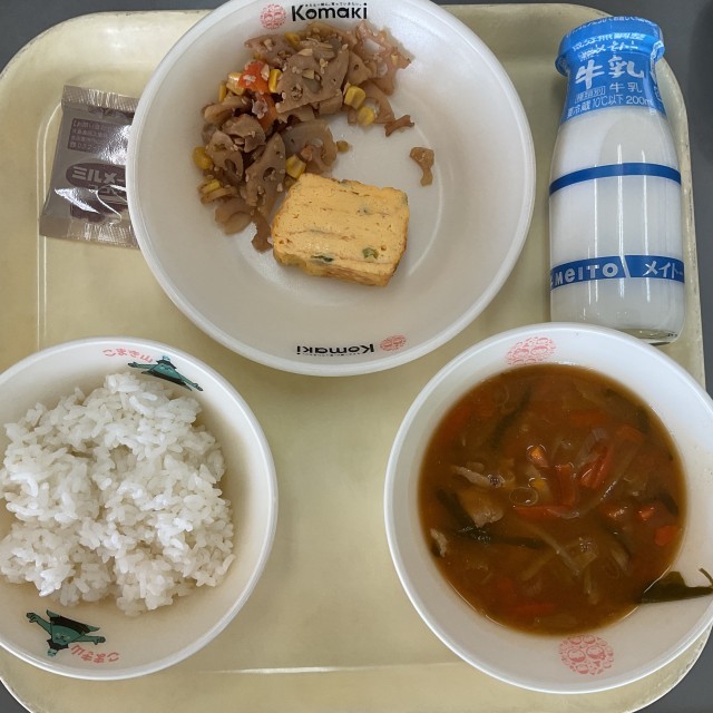 ごはん 牛乳 かぼちゃのキムチ汁 ねぎ玉焼き れんコーンきんぴら ココア牛乳のもと