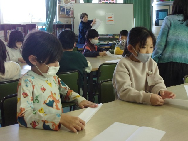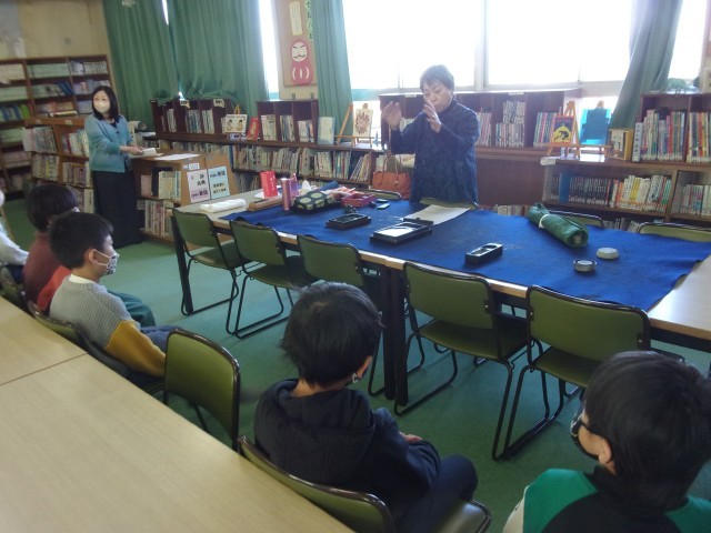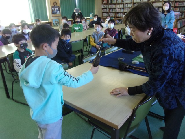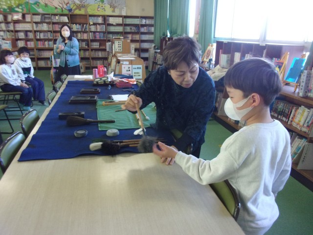 来年から始まる毛筆の準備学習として、いろいろな動物の毛からなる筆の紹介や墨のすり方、半紙の折り方など、たくさんのことを教えていただきました。