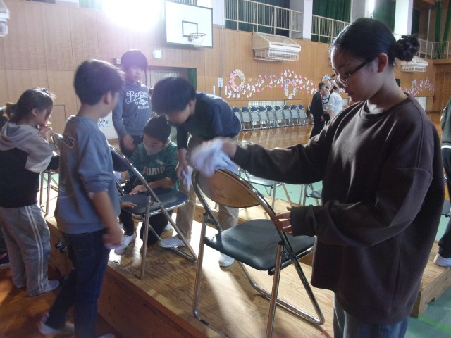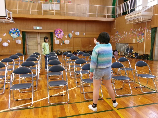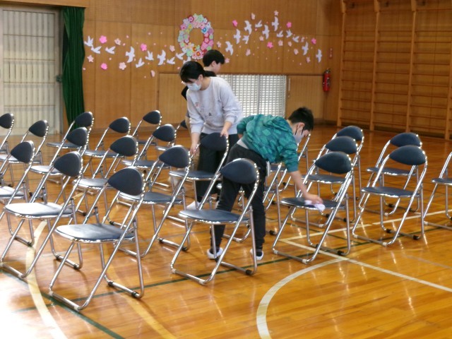 3月19日の卒業式に向け、5年生が体育館の椅子並べをしました。
