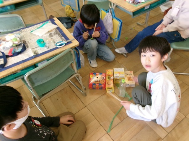 いろいろな音の鳴る材料を集め、作品づくりを楽しみました。