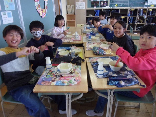 卒業式前日の「お祝い献立」メニュー(みそカツやクレープなど)をみんな美味しそうに食べていました。