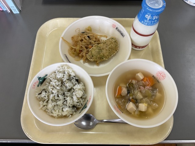 わかめごはん 牛乳 春のすまし汁 あじの磯辺天ぷら 千草あえ