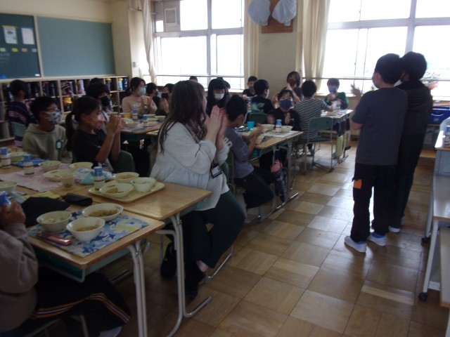 写真は、6年生が「いただきます」の前に、今日誕生日を迎えた仲間をお祝いしている場面です。