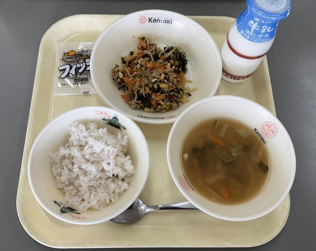 麦ごはん 牛乳 中華コーンスープ ビビンバ 乾燥小魚